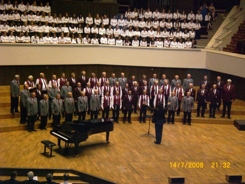 von Jonathan Willcocks statt. Erik Schober hat seine Männerchöre aus Taucha, Torgau und Ermlitz zur einem Projektchor zusammengefasst und damit einen imposanten Chorkörper geschaffen. Das die Männerchöre die meisten Stücke ohnehin im Programm haben, war es interessant zu erfahren, dass bei gleichen Stücken jeder Chor eine andere Interpretation verfolgt. Das gemeinsame Singen war schon eine besondere Erfahrung. |