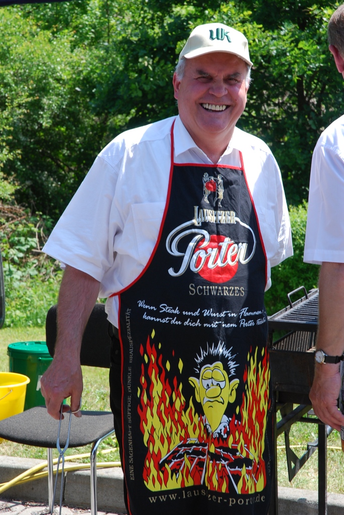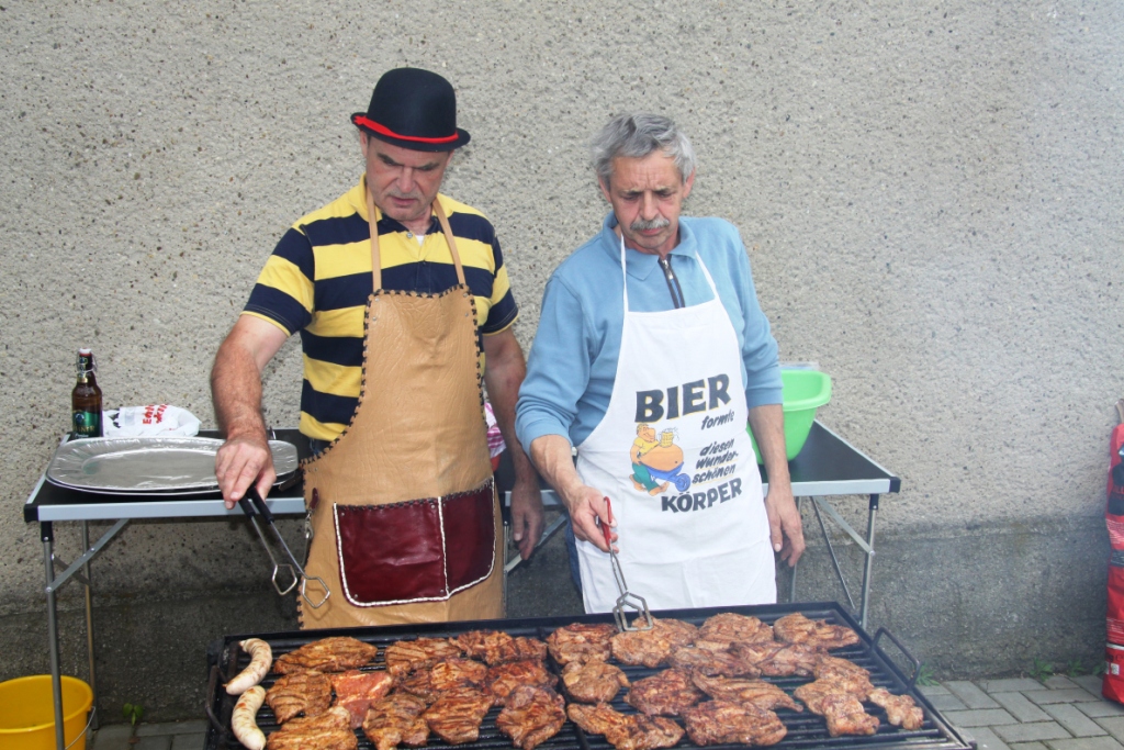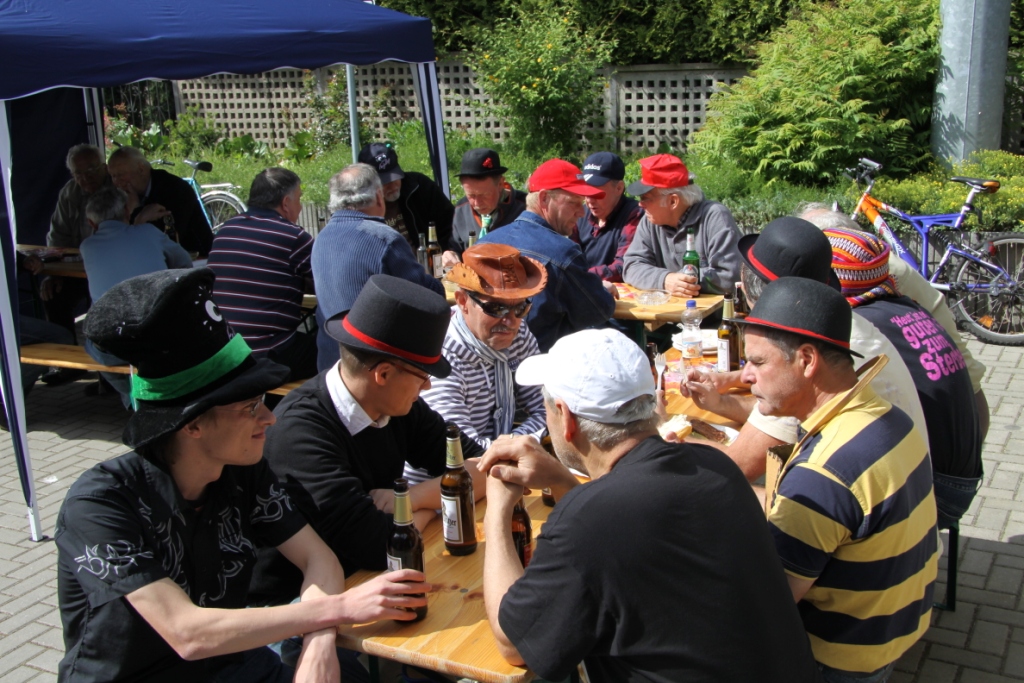 Der Wetterbericht informierte über einen voraussichtlich "regnerischen und kalten" Himmelfahrtstag. Aber scheinbar hatte der Wettergott die Anstrengungen der Männer im Männerchor richtig gewürdigt und ließ die Sonne scheinen. So hatten wir einen sonnigen und warmen Männertag. Wie immer standen Spezialisten am Grill Bodo Joost und Norbert Ullrich sorgten für die richtige "Fleischtemperatur" Weitere hilfreiche Hände waren für die niedrigeren Arbeiten auch pünktlich da. Im laufe des Nachmittages kamen noch einige Gäste, teilweise so gar auf ihren Fahrrädern. So war der Kreis der feiernden Teilnehmer nicht nur aus Ermlitz, Rübsen und Oberthau sondern auch aus Schkeuditz und Halle Neustadt. Heute dominierten die besonderen Kopfbedeckungen. Und wer keine hatte, der erhielt zum Schutz gegen die Sonnenstrahlen eine Perücke. So war der "Bürgermeisterhof" bis in die späten Abendstunden erfüllt von singenden und feiernden Männern. Besonderer Dank gilt aber auch dem "Musikmeister" des Tages. Jürgen Rauch hatte seine komplette Technik mitgebracht, damit wir im Probenraum wie auch im Hof ständig unterhaltsame Musik hatten.