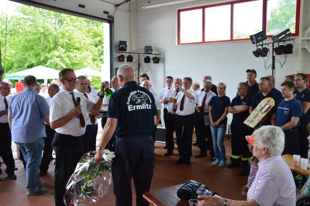 Die Vorsitzende des Frauenchores gratulierte im Namen aller Sängerinnen beiden Jubilaren mit einem Präsent. Dafür sagt der Männerchor an die Frauen noch einmal Danke. Die FFW Ermlitz erhielt natürlich zu ihrem Jubiläum auch Glückwünsche und ein Präsent vom Männerchor Ermlitz.